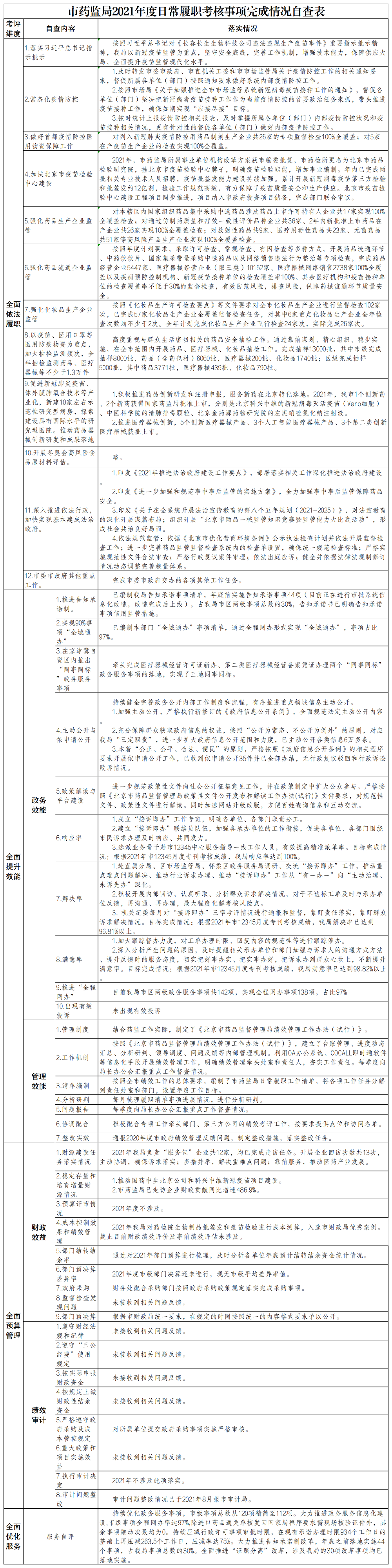 (四)牢牢守住药品安全底线。一是持续加大监督检查力度。以国家集中带量采购中选企业和品种,精神药品等特殊药品品种,新冠病毒检测试剂、医用口罩等为重点开展监督检查。开展医疗器械质量安全风险隐患排查治理、儿童化妆品专项检查、网络销售违法违规行为专项检查,实施药店经营防疫用品和防控措施监督检查。加强全市药物警戒和药械不良反应监测。完成药品、医疗器械和化妆品抽检1.3万件,药品监督抽检合格率99%以上。二是不断深化法治建设。建立强化打击“两品一械”违法行为协作联动工作机制,制定行政处罚裁量权适用规定及裁量基准配套制度,动态调整行政检查单并公示。在全国药监系统率先制定发布“八五”普法规划。市药检院成为全国首批药品法治宣传教育基地。开展中药配方颗粒标准修订工作,首批发布的121个品种。推进仿制药质量和疗效一致性评价,68个品种通过。三是扎实推进阳光监管。全面规范政府信息公开工作,不断提高药品监管工作透明度,已主动公开各类信息5万余条。